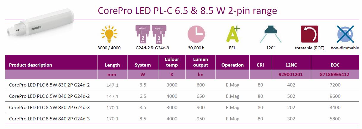 Philips CorePro LED PL-C 2-pin range: