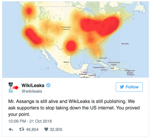 A tweet issued by WikiLeaks after the DDoS attack on some of the world’s leading websites.