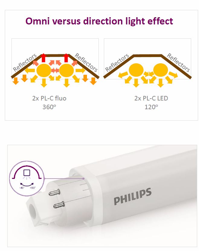 • Therefore the CorePro LED PL-C lamp also requires less light (lumen) to reach the same lux levels.