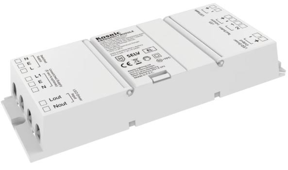 Kosnic UEM04 LED 4W Universal Emergency Module Pro is designed for use with all LED luminaires (class III) with external driver. Provides an operation time of three hours. The UEM can be installed within a luminaire or within the ceiling void. Built-in loop-in loop-out terminals for 2 x 3-core cables. Built-in cable clamp, push to release. Easy Plug & Play installation. For maintained or non-maintained emergency lighting systems.